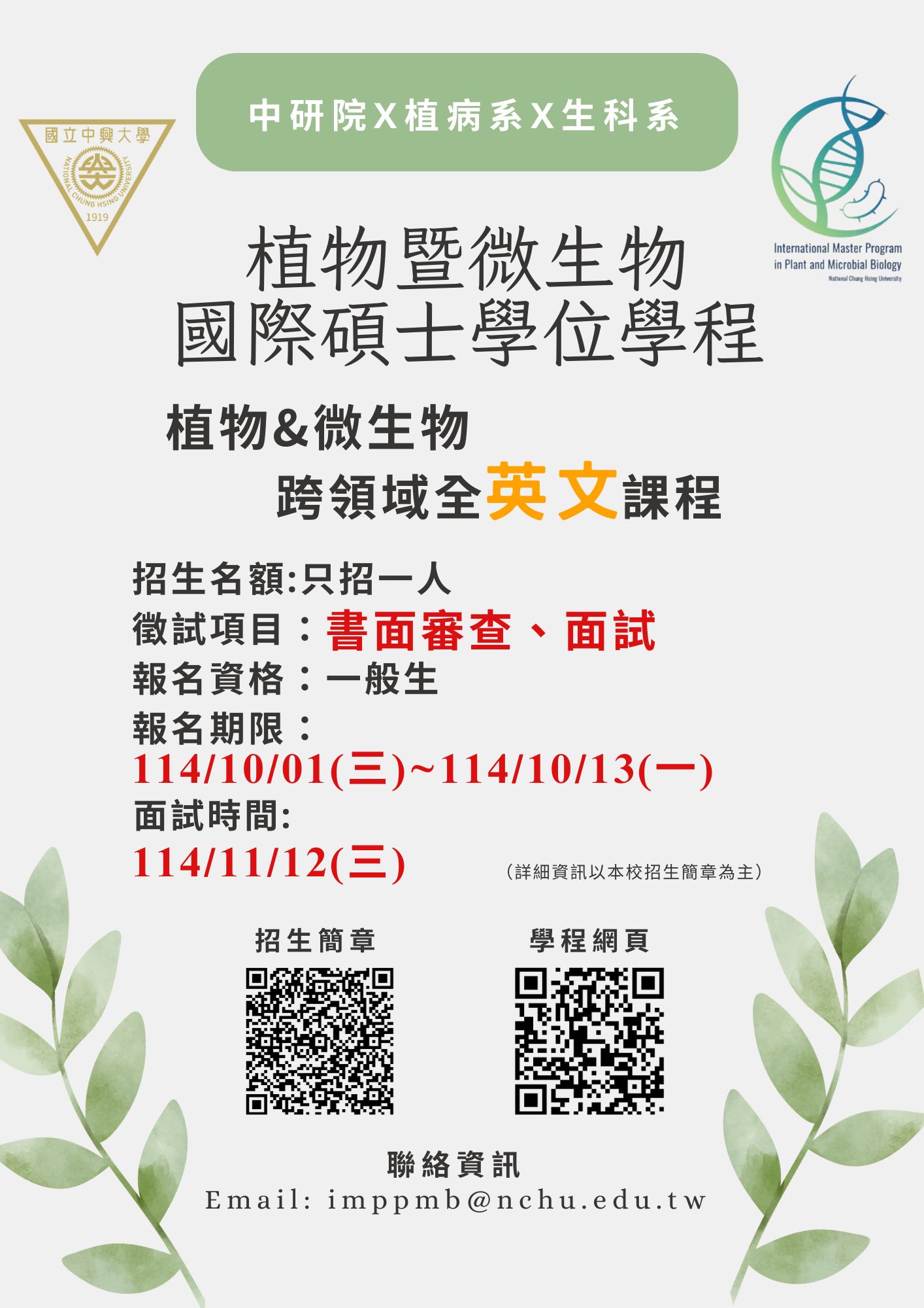 115學年度學年度中研院植微所與中興大學合作之植物暨微生物國際碩士學位學程招生