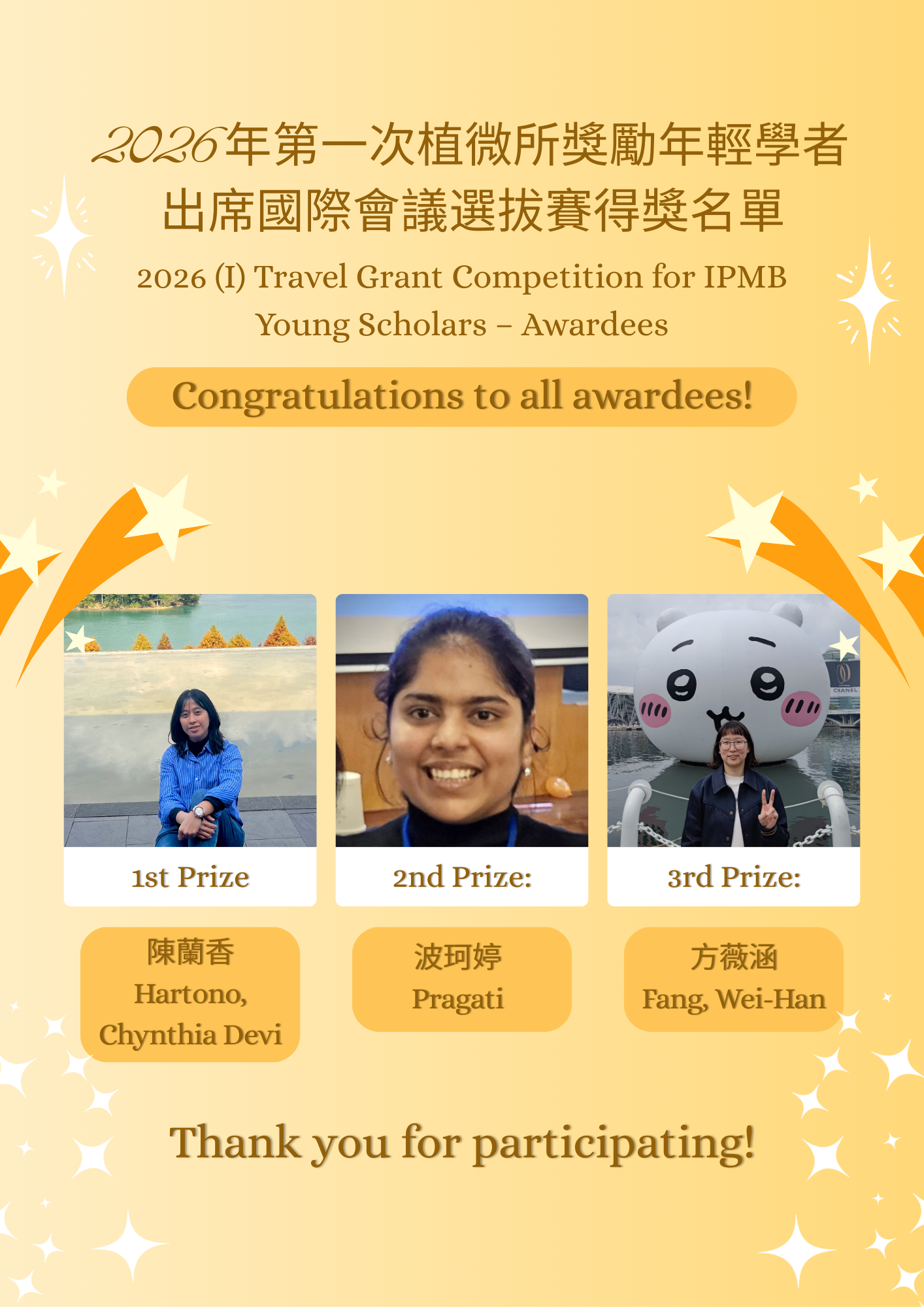 2026 (I) Travel Grant Competition for IPMB Young Scholars – Awardees POST:2026-02-02 16:19:43 Awardee Lab/PI name 1st Place Hartono, Chynthia Devi Dr. Ho, Chin-Min 2nd Place Pragati Dr. Jauh, Guang-Yuh 3rd Place Fang, Wei-Han Dr. Ho, Chin-Min