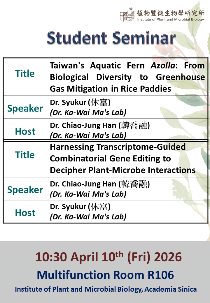 Taiwan's Aquatic Fern Azolla: From Biological Diversity to Greenhouse Gas Mitigation in Rice Paddies POST: 2025-04-25 11:08:47 Time 2026-04-10 10:30 Speaker Dr. Syukur (休富) Location Multifunction Room R106, Institute of Plant and Microbial Biology, Academia Sinica Affiliation Dr. Ka-Wai Ma's Lab